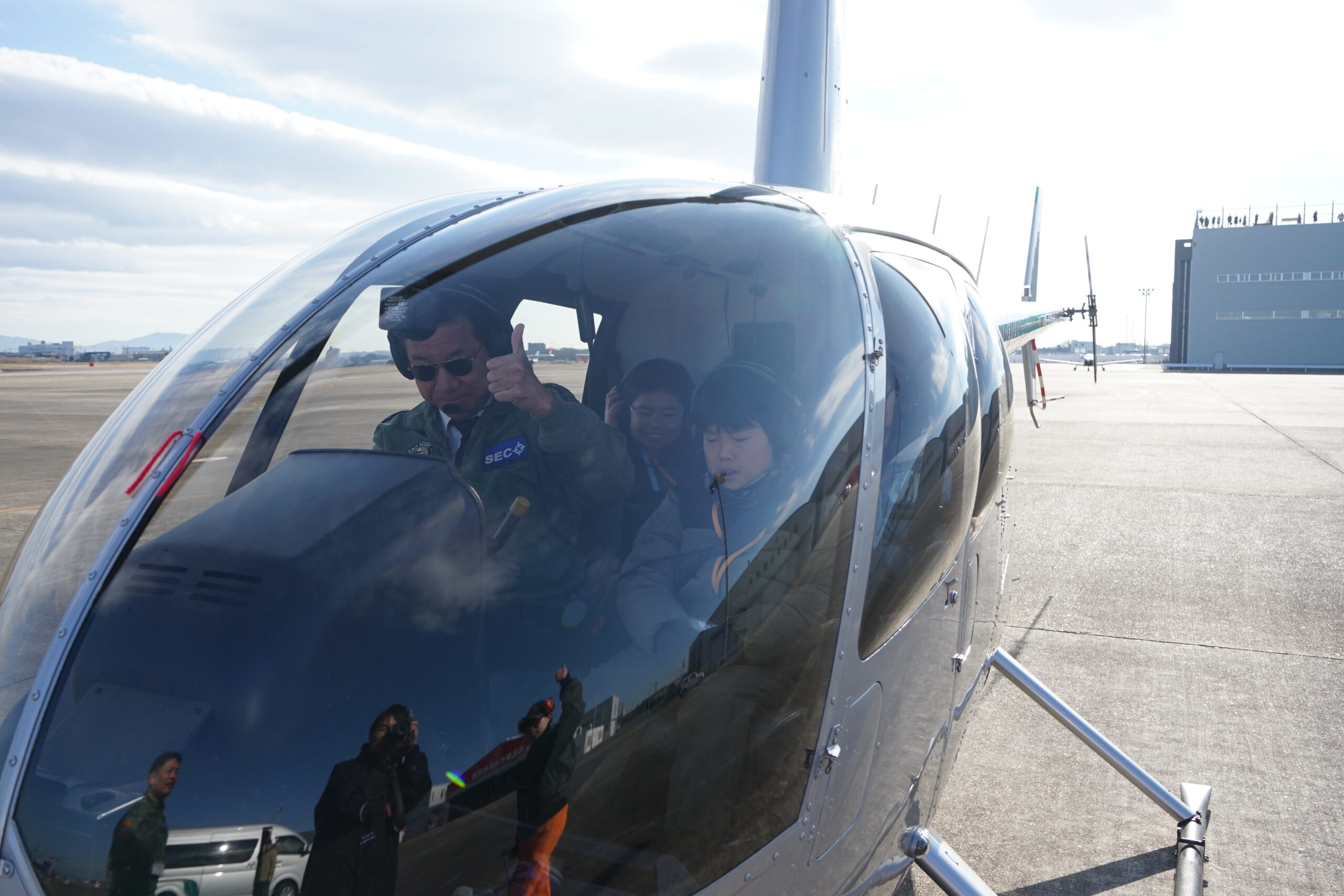 今回の講義では、これまでに学んできた空を飛ぶ乗り物の1つである「ヘリコプター」に参加者のみなさんが実際に搭乗し、空を飛びました!