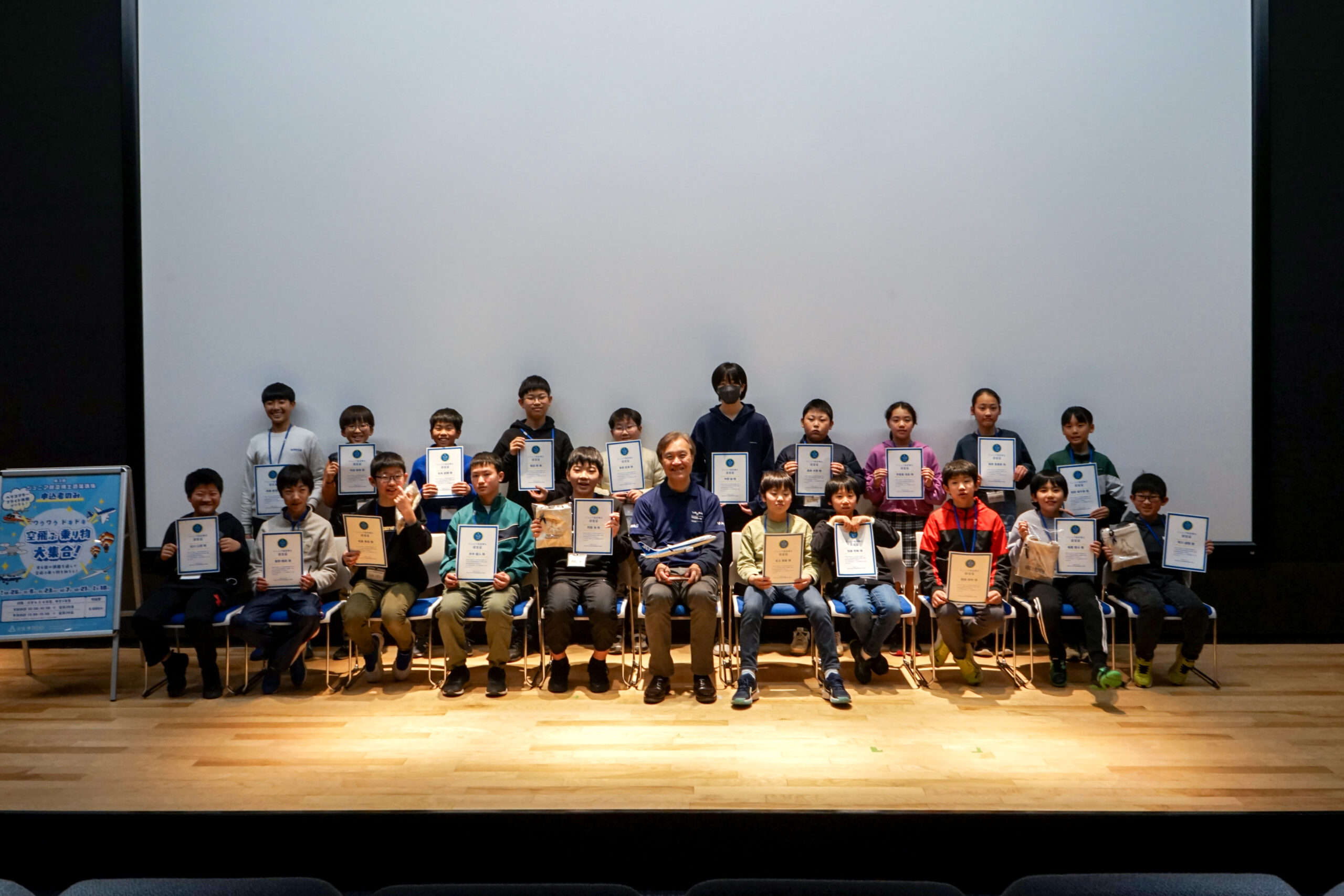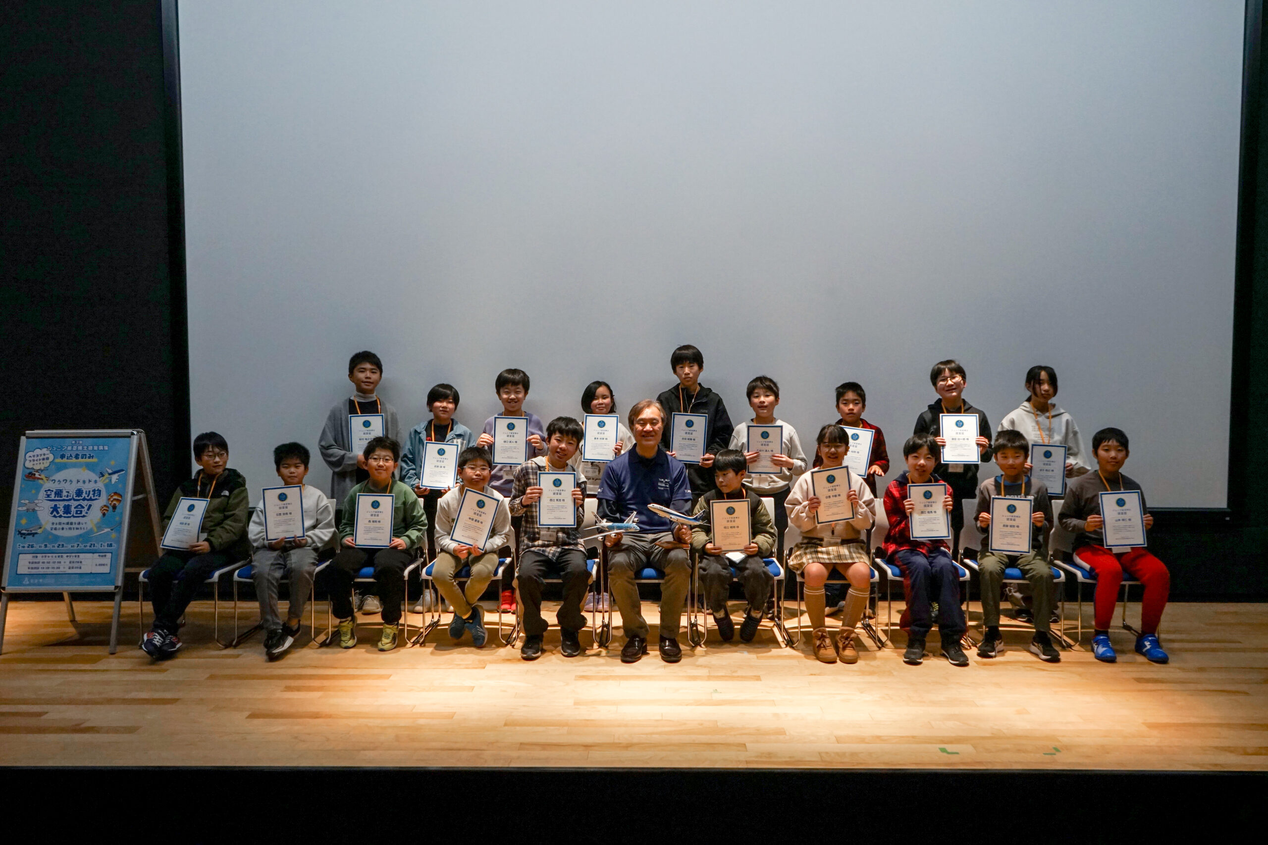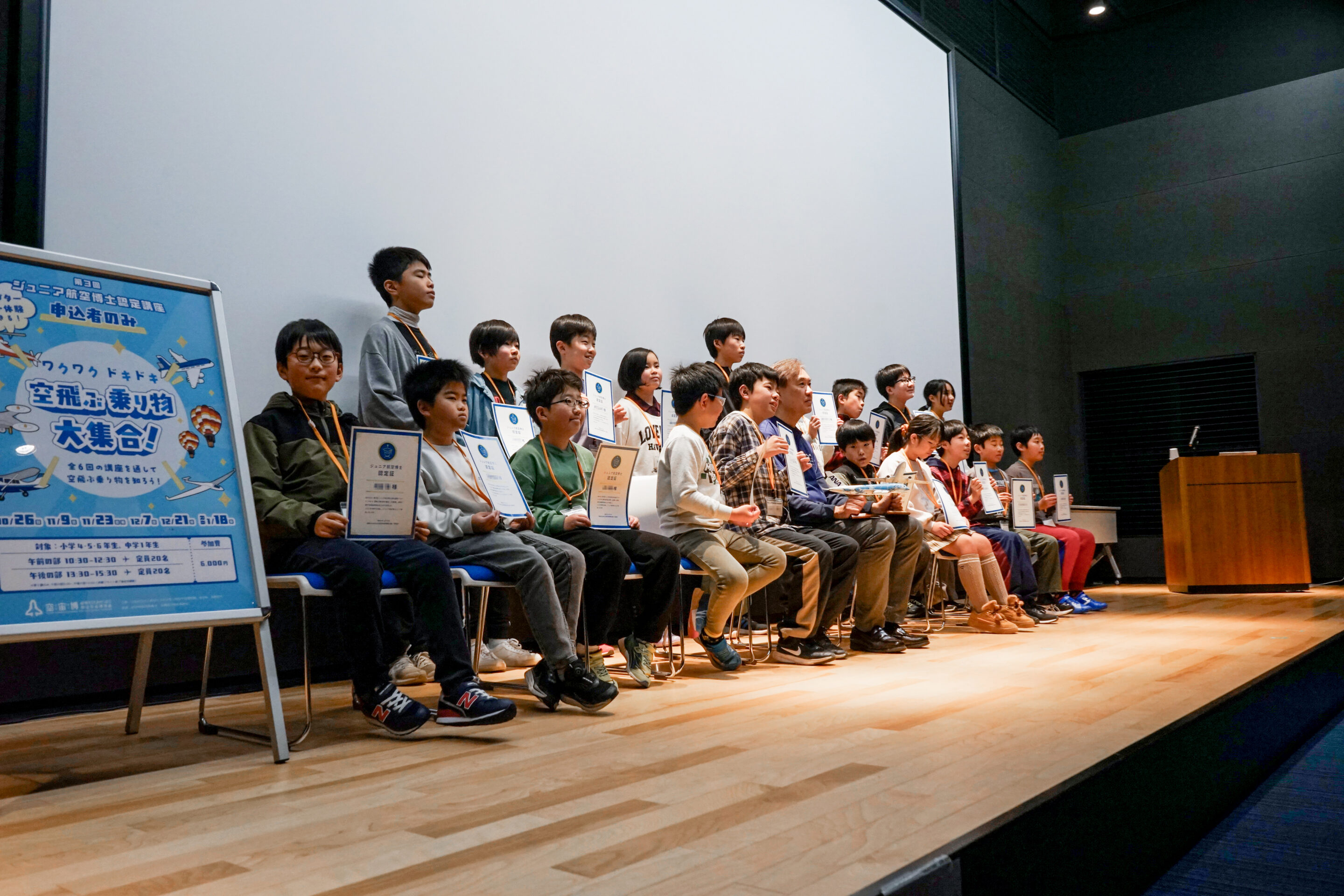 講座の後半では、ジュニア航空博士認定の認定式を行い、参加者の皆さんをジュニア航空博士として認定しました。