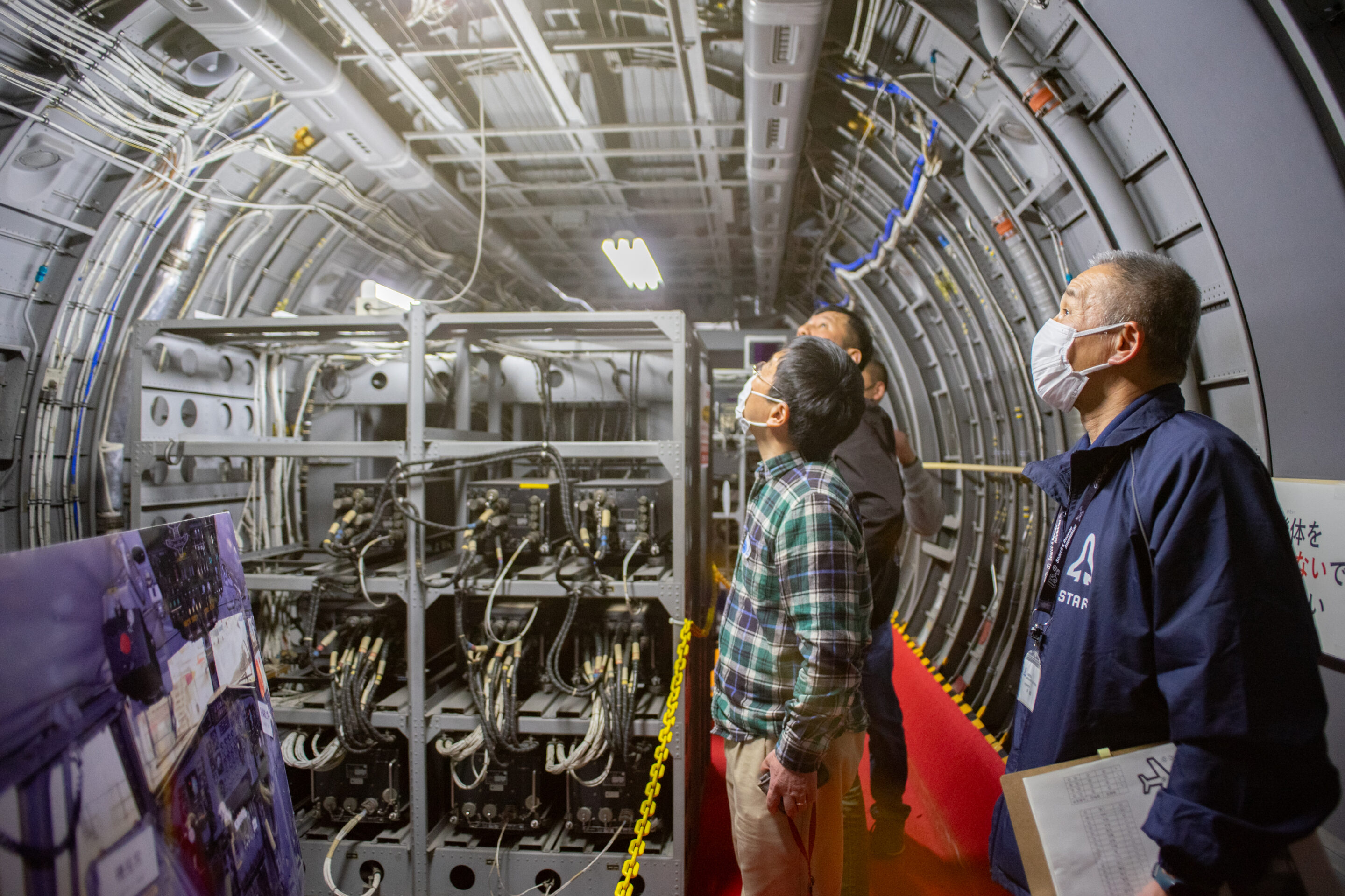 普段は入ることができない飛鳥の機内。この機会に、SCAS(エスキャス。コンピューターで飛行制御を補助するシステム)機器や計測機器などを見てみませんか。
