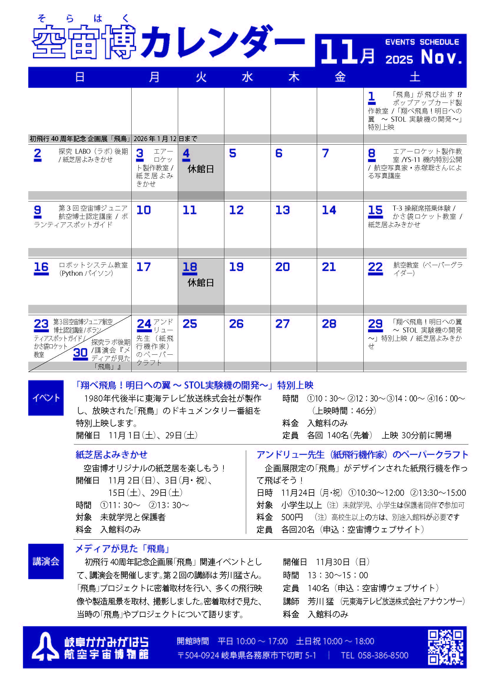 お知らせ 空宙博イベントカレンダー(2025年11月) 更新日:2025.10.24 たくさんのイベントをお見逃しなく! イベントや教室のカレンダーです。ご来館の参考に、ぜひご覧ください。 イベントカレンダー2025_11月 前の記事 お知らせ一覧へ 次の記事